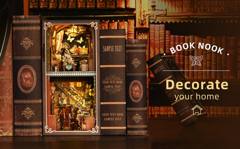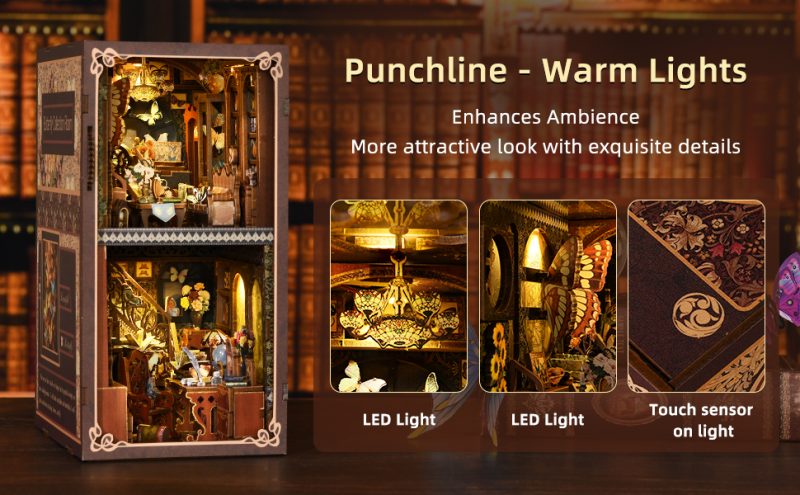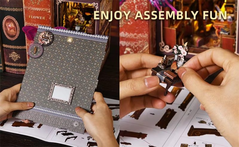 • Materiali di Alta Qualità: Realizzato in legno pregiato con tagli laser di alta precisione, arricchito da accessori in plastica e componenti elettronici, questo Book Nook è un pezzo da collezione destinato a incantare ogni osservatore.