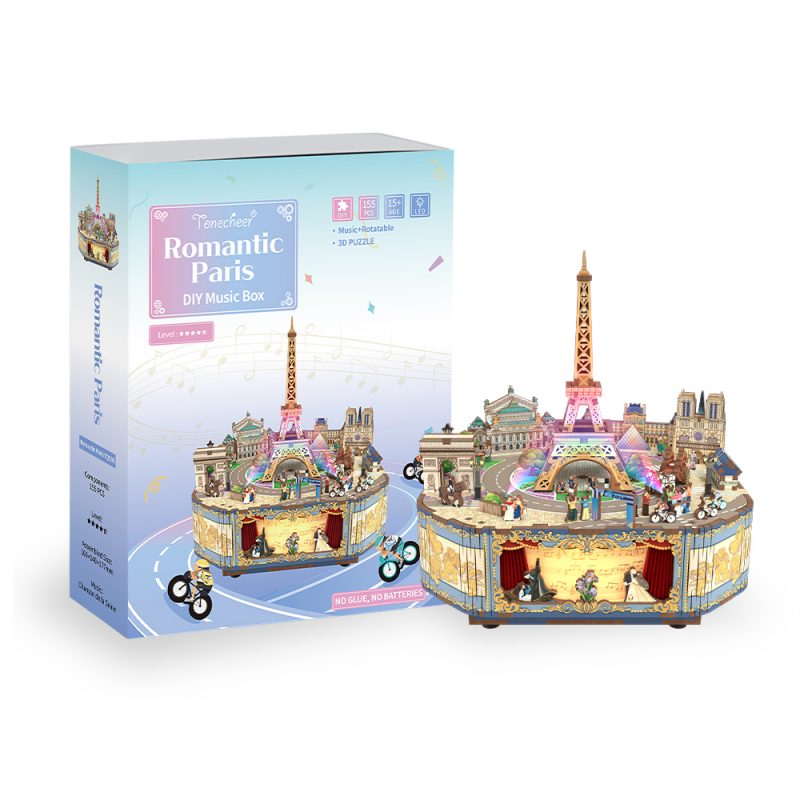 Trasforma il tuo angolo preferito in un’incantevole scena parigina al chiaro di luna con il Romantic Paris 3D Puzzle Wood – Carillon della Tonecheer. Questo non è un semplice puzzle, ma un carillon meccanico rotante in legno che celebra l’eleganza senza tempo di Parigi.