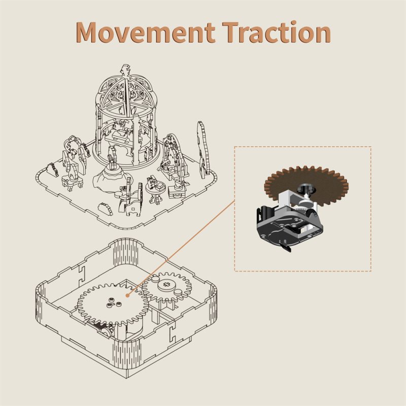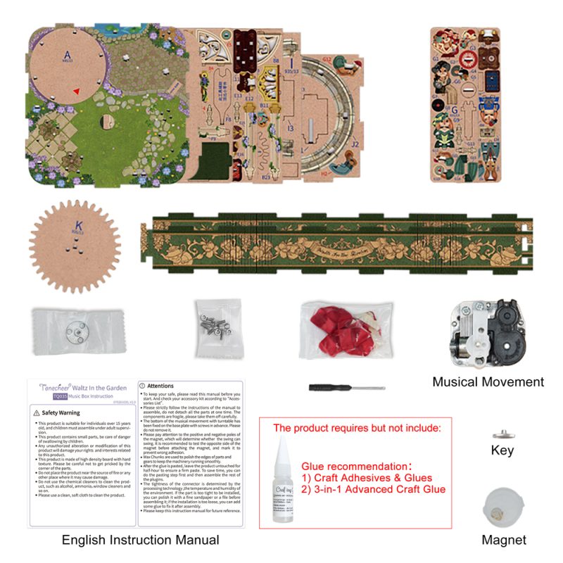 - Movimento di Valzer: Il termine “Waltz” (Valzer) indica un movimento rotatorio specifico. Una volta assemblato, il kit si anima! Funziona come un vero carillon a carica e la scena centrale ruota, simulando l’elegante volteggio di un valzer.